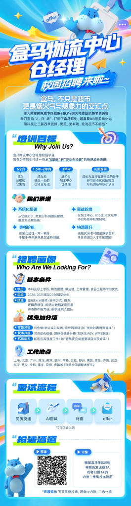 培训目标:盒马物流中心仓经理校招项目,旨在为应届生打造一条从“0基础”到“专业仓经理”的快速成长通道!